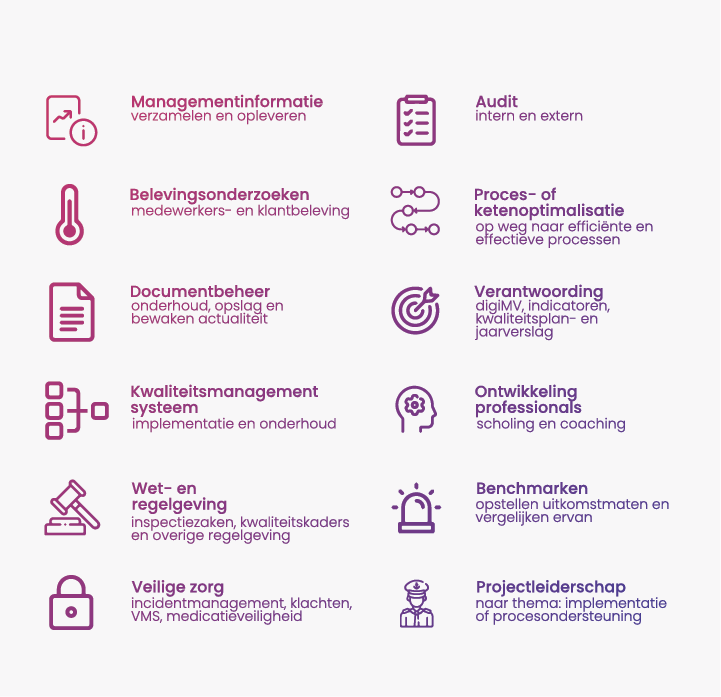 - Adviseren over het kwaliteitsmanagementsysteem waarna professionals zelf aan de slag gaan;